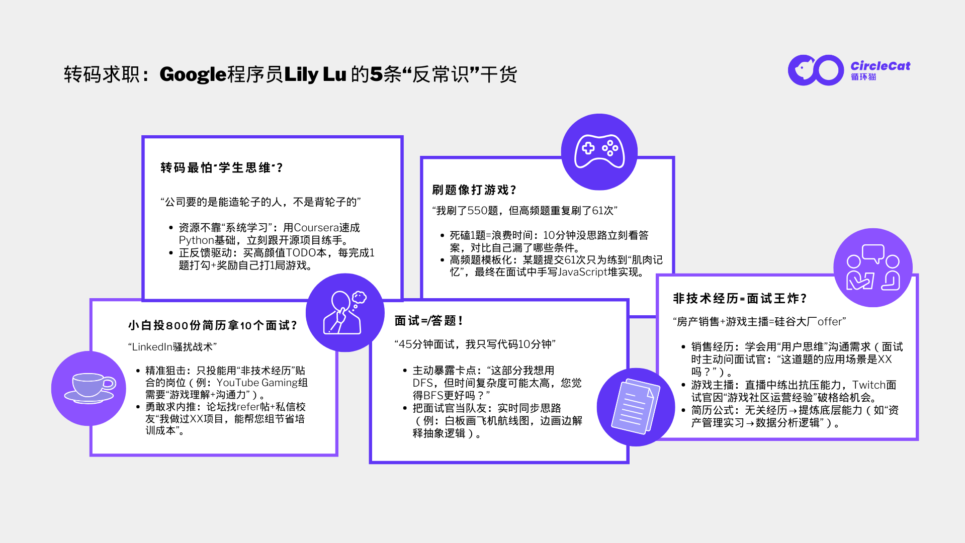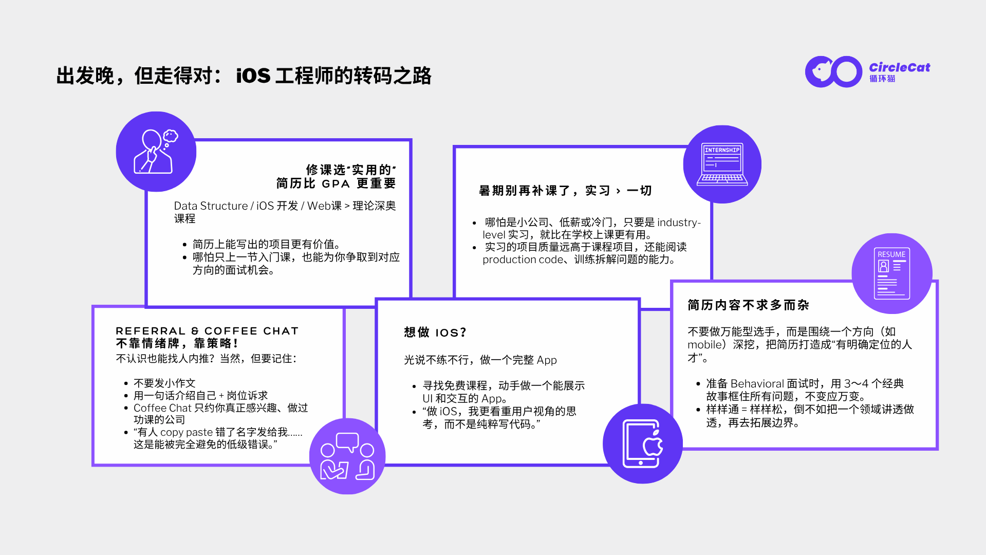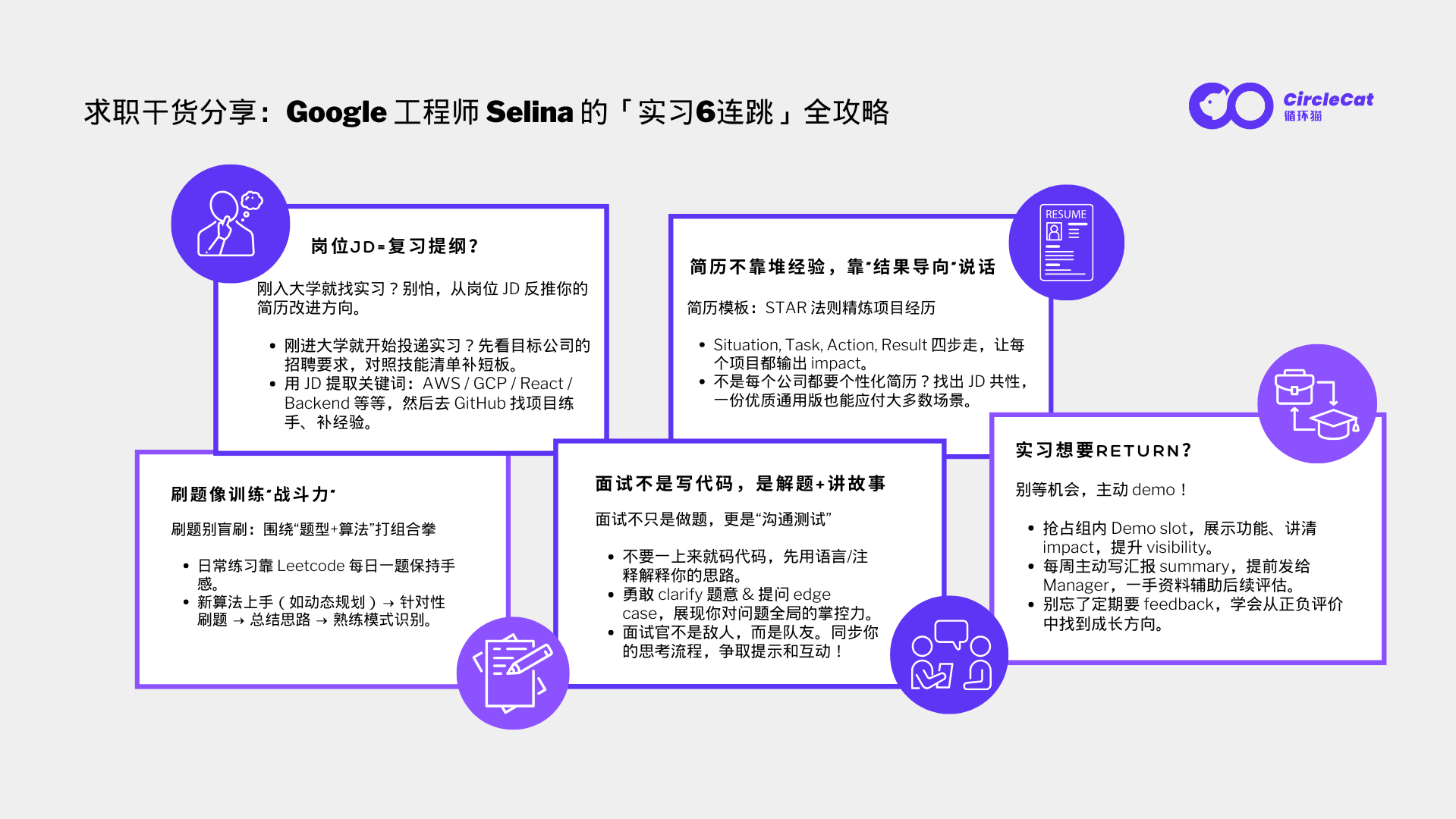 CircleCat Seminar Series 是循环猫推出的系列讲座交流活动,我们 将邀请来自科技行业的在职大厂员工分享ta们的职业规划、转码心 得、职场趣闻……